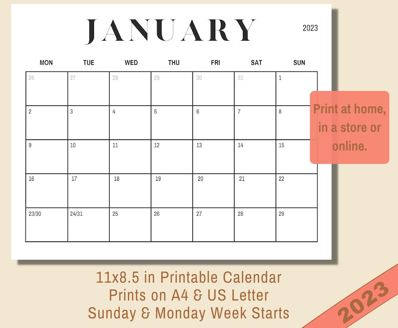 2023 printable calendar yearly calendar 2023 office etsy uk - 2023 calendar template 85 x 11 inches horizontal monthly printable | 2023 printable desk calendar